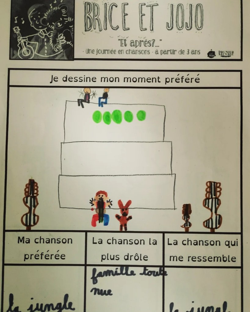 - Goûter en chansons en maternelle : Ateliers de pratique de chant choral dans 3 classes de GS autour de 3 chansons du spectacle Brice & Jojo avant de partager un goûter et chanter ensemble (Isère, 2022).